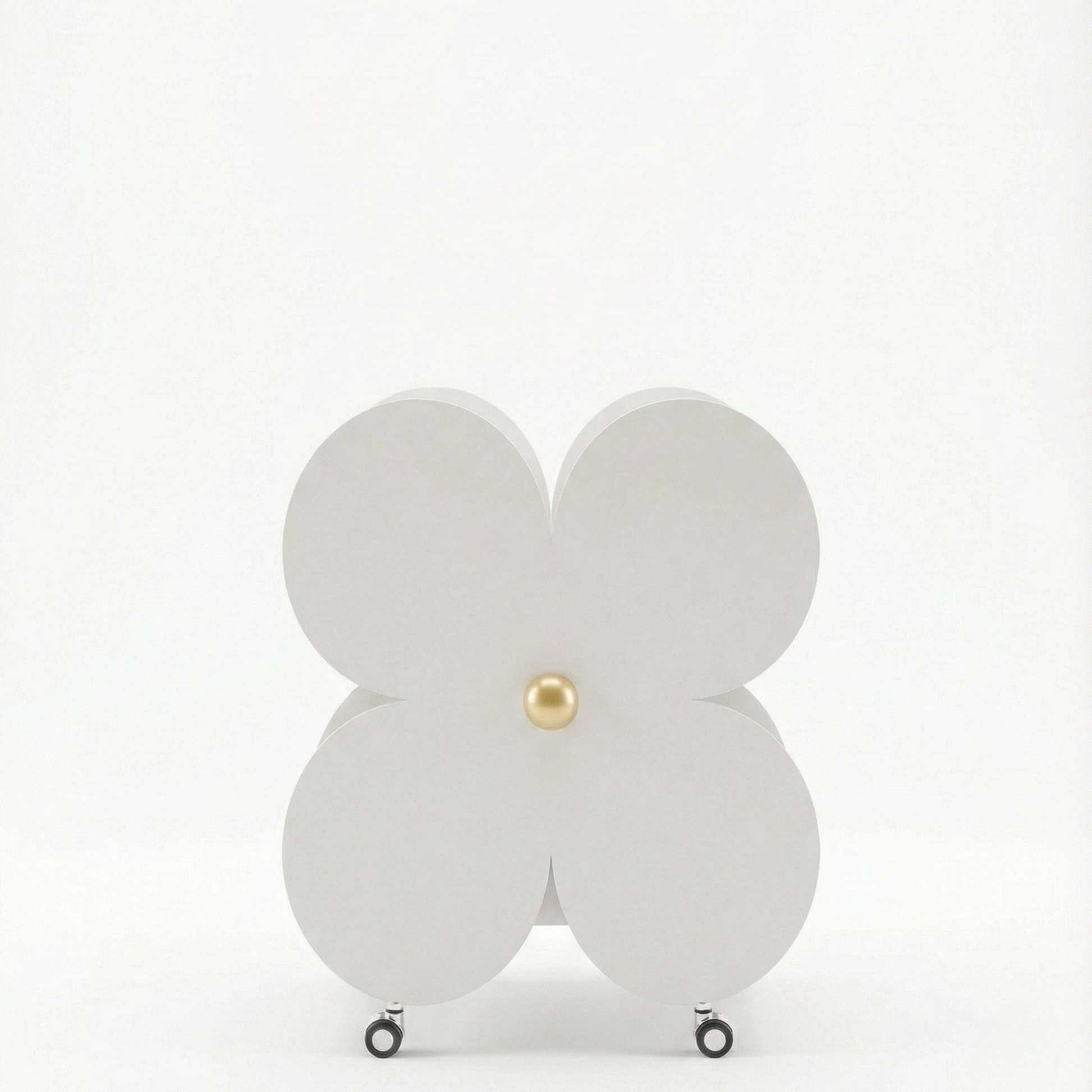 Organize with style using the Whisper Tea Cart. Breaking away from traditional sharp angles, this piece features a distinctive floral geometric design that acts as a sculptural focal point in any modern home. The two-tier open shelving offers ample space for books, botanicals, or beverage service, while the gold central accent adds a sophisticated metallic pop against the matte white frame. Equipped with 360-degree wheels, it offers versatile, move-anywhere storage that doesn’t compromise on design.